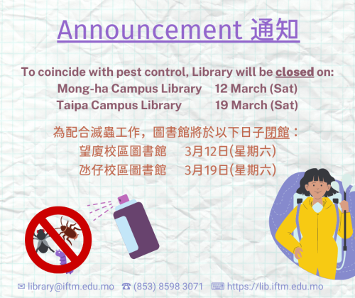 To coincide with pest control, Library will be closed on the following dates:Mong-ha Campus Library: 12 March (Sat)Taipa Campus Library: 19 March (Sat)Please feel free to approach us if we can be of further assistance.