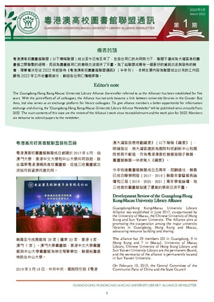 The first issue of "Guangdong-Hong Kong-Macao University Libraries Alliance Newsletter" jointly edited by the University of Macau Library, Sun Yat-sen University Library and the Chinese University of Hong Kong Library was officially released on April 14 2022.