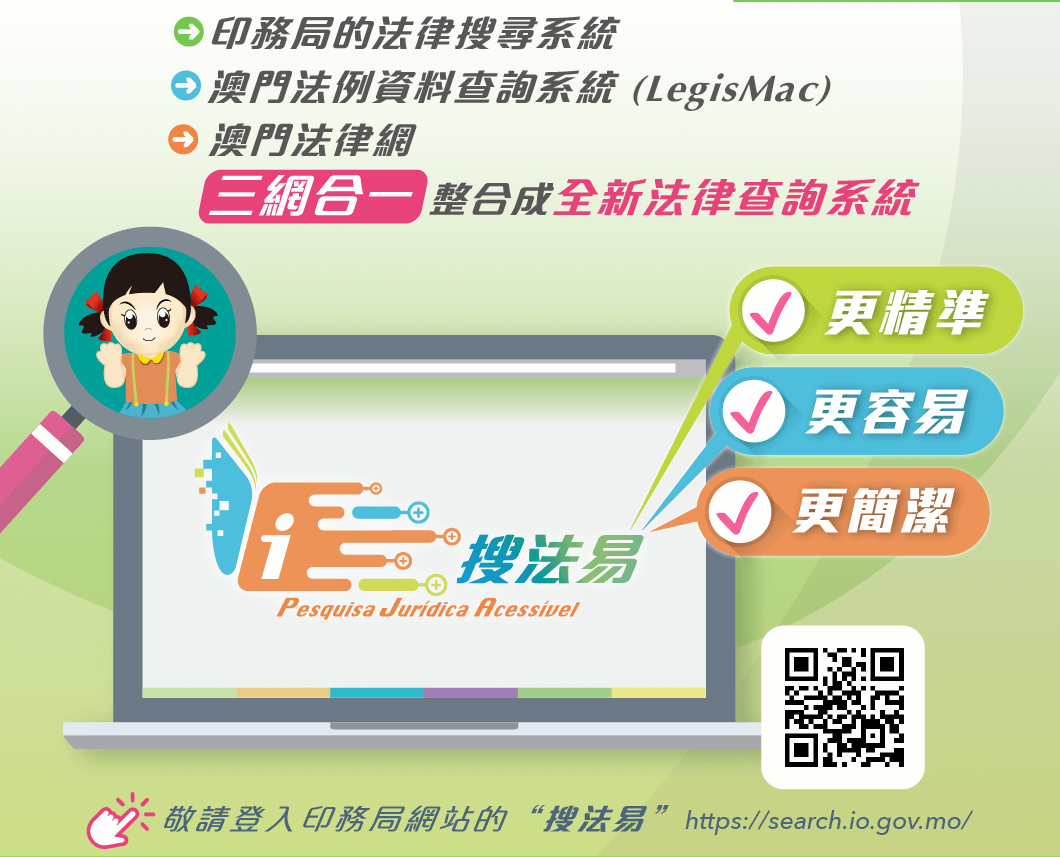印務局的法律搜尋系統、澳門法律資料查詢系統(LegisMac)、澳門法律網(MacaoLaw)已整合成 “